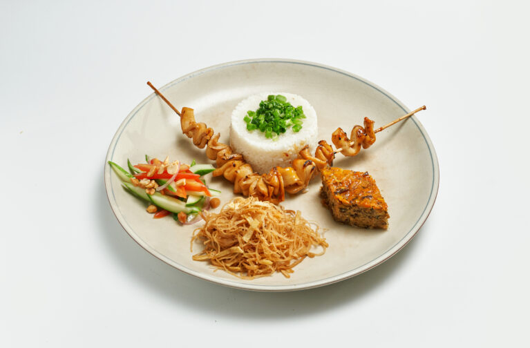 Thành phần: Chân nấm La Hán, chả hấp, gạo tấm, cà chua, hành tây, dưa leo, miến Thái, thính, sốt chua ngọt
