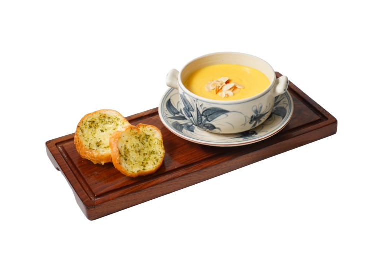 Thành phần: Bí đỏ và khoai tây xay nhuyễn hòa quyện với sữa hạnh nhân, dùng kèm bánh mì bơ tỏi