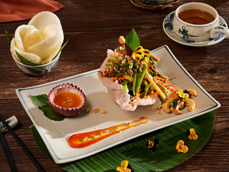 Thành phần: Rau tiến vua, Hạt điều rang, cà rốt, Nấm bào ngư, Đậu hủ, ớt sừng đỏ, Rau thơm: quế, húng lủi, ngò rí, Sốt chanh dây, Bánh phồng ăn kèm
